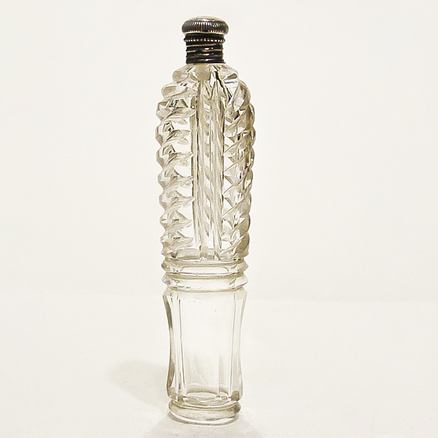 Essencier de cristall tallat, amb una petita tapa de plata. De base ovalada i cos allargat.