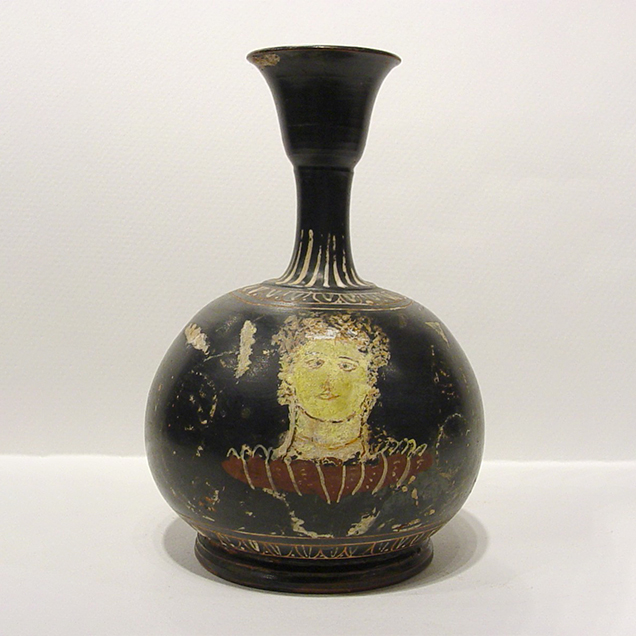 Aribalesque lekythos, decorated in red, yellow and white, with border. A female head is in the middle of the vessel, surrounded by flowers.