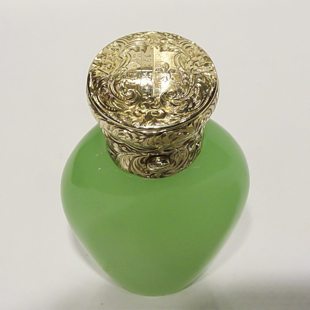 Green opaline, with gold stopper and engraved coat of arms. Oval-shaped.