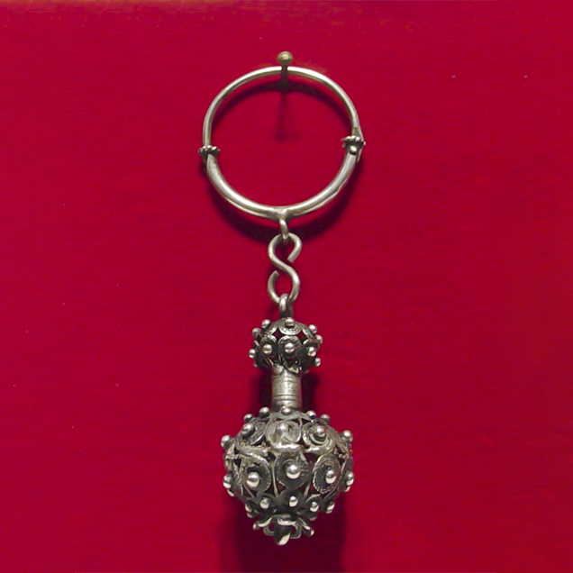 Formed by two silver arches with filigree pendant. Two small doves, believed to protect against evils that could enter the ear, hang from the bottom of the pendant. The insides of the pendants are designed to hold perfumed fabrics.