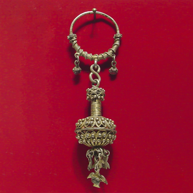 Formed by two silver arches with filigree pendant. Two small doves, believed to protect against evils that could enter the ear, hang from the bottom of the pendant. The insides of the pendants are designed to hold perfumed fabrics.