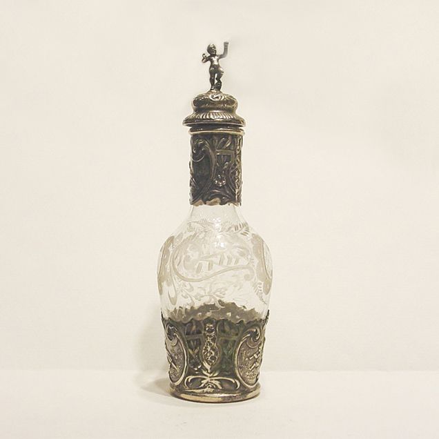 Cylindrical body engraved with geometric motifs. Silver stopper with the figure of a little boy. Neck and base with silver overlay engraved with scenes of musicians playing instruments.