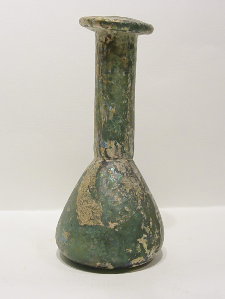 Ungüentario de vidrio soplado verdoso oscuro; depósito cónico y cuello alargado con reborde. Frasco muy irisado.